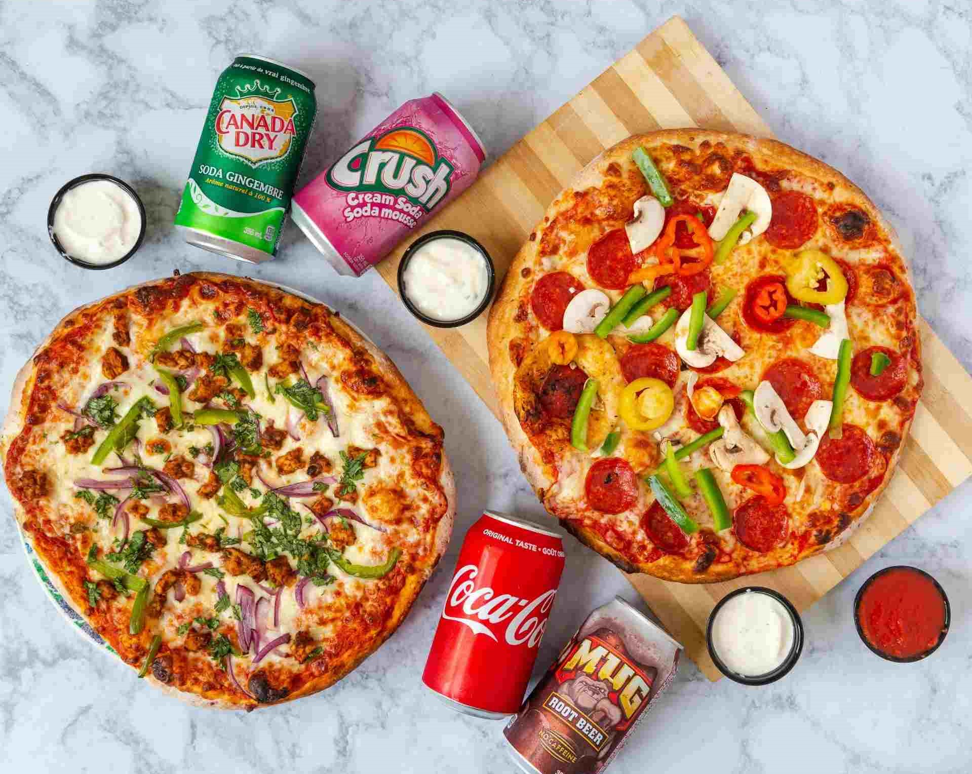2 Pizzas, 4 Toppings Each, 4 Pops & 2 Dips