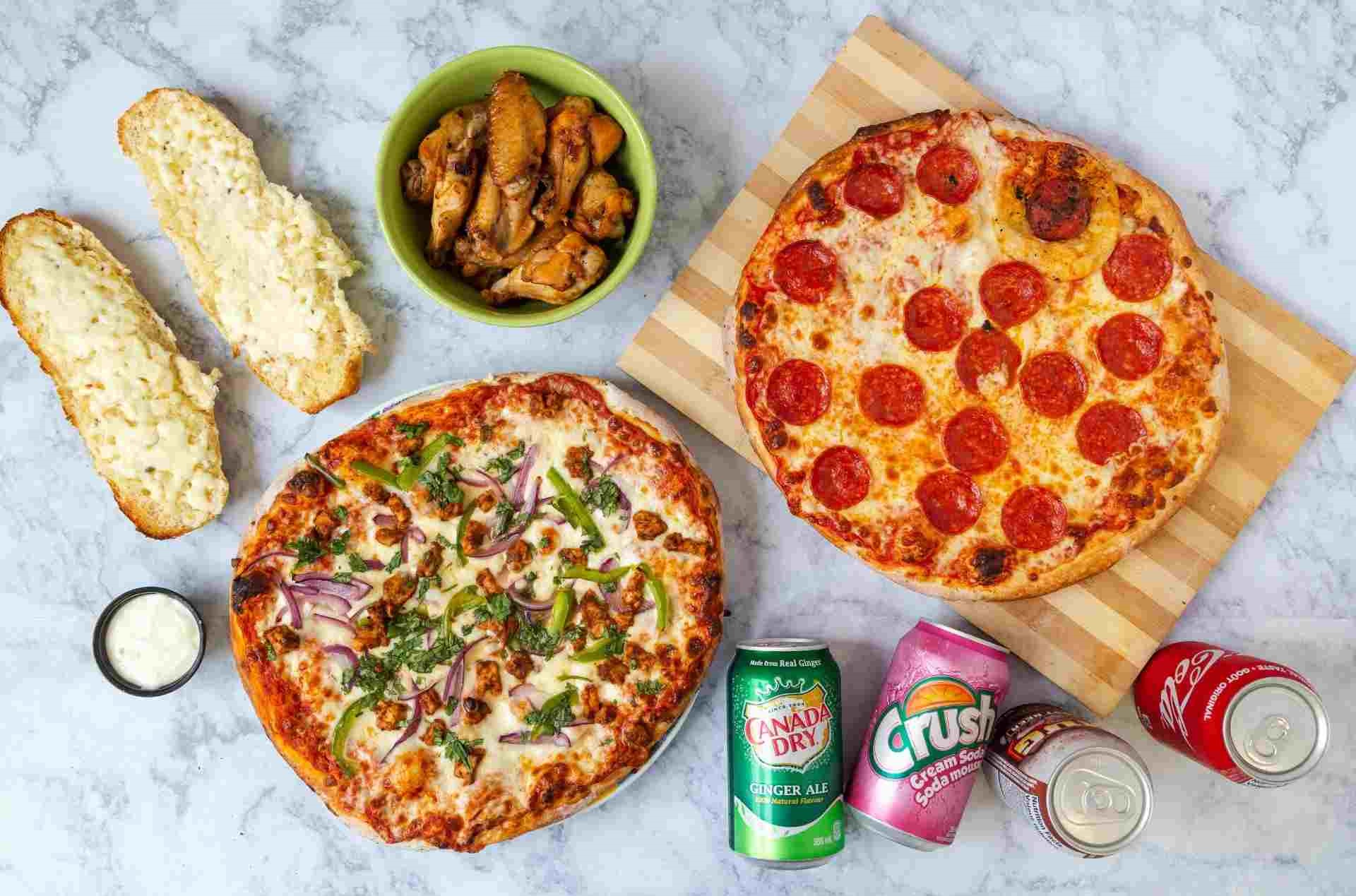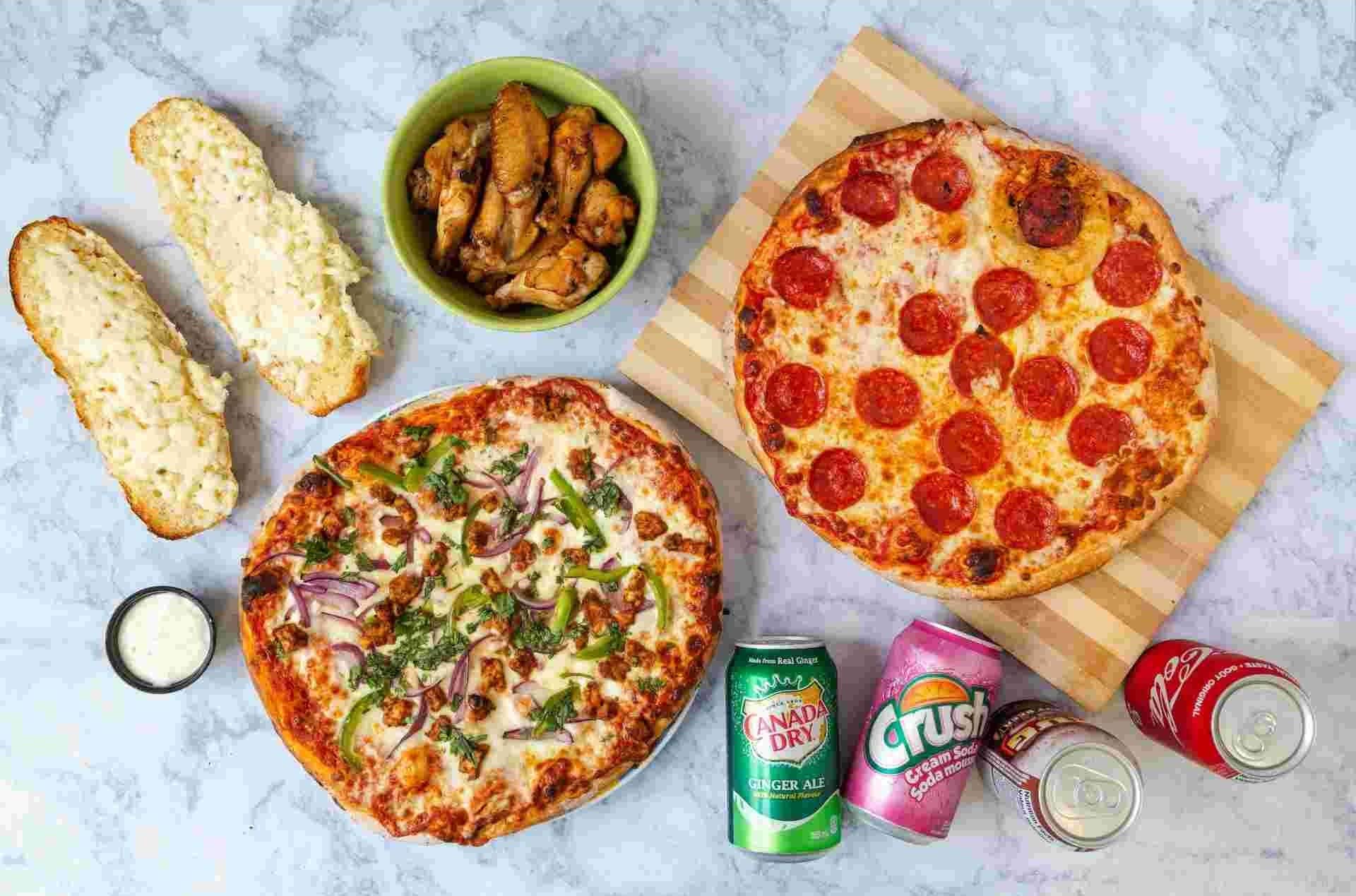 2 Pizzas, 3 Toppings Each, 1 Lb Wings, 1 Garlic Bread, 4 Pops & 2 Dips
